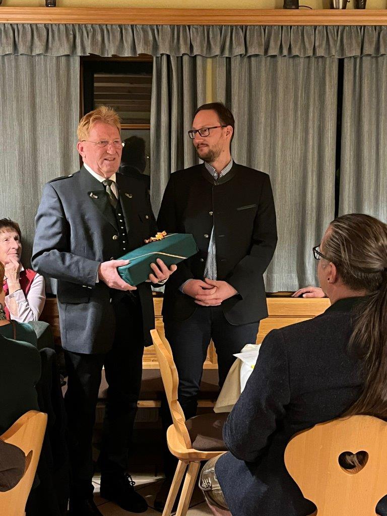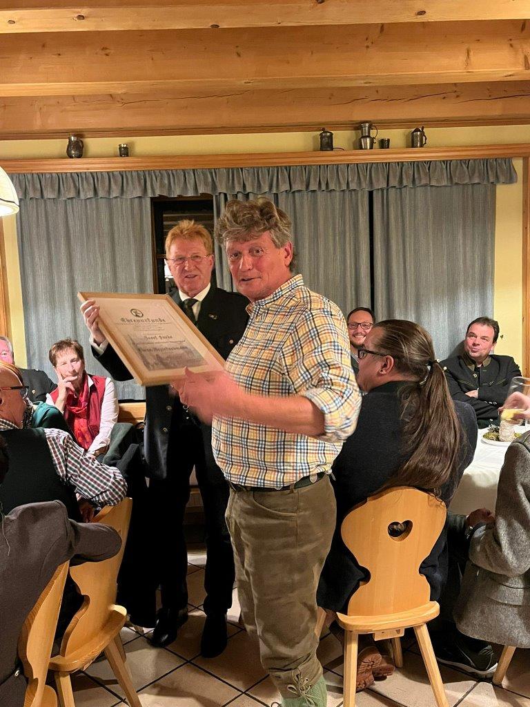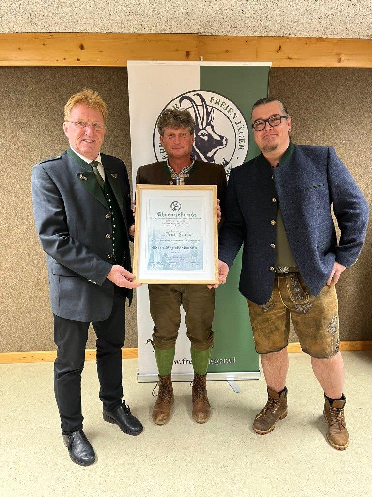 Nachdem Josef Fuchs anlässlich des diesjährigen Bezirkstages seine Funktion als Obmann des Bezirkes der Freien Jäger zur Verfügung gestellt hatte war eine lückenlose Nachfolge dieser Position erforderlich geworden. Josef Fuchs trat im Jahr 1996 den Freien Jägern bei und übernahm bereits im Jahr 2000 die verantwortungsvolle Funktion des Bezirksobmannes. In diese Zeit seines Wirkens fielen Projekte wie der Ausbau der Schießstätte des Theresianums, seit dem Jahr 2017 der kompetente Beistand bei der Durchführung des Jagdkurses des Vereins „Praxis Natur“ sowie zahlreiche organisatorische Tätigkeiten im Rahmen der Vereinsführung. Besonders erwähnenswert ist die Tatsache, dass sich während seiner Obmannschaft die Mitgliederzahl der Bezirksgruppe nahezu verdoppelt hat. Diese Verdienste veranlassten den Bezirksausschuss mit einstimmigem Beschluss vom 1. Oktober 2023 Herrn Josef Fuchs zum Ehren-Bezirksobmann zu ernennen. Im Rahmen des diesjährigen Bezirkstages wurde nach einer eingehenden und wertschätzenden Laudatio des interimistisch mit der Führung der Bezirksgruppe Liezen betrauten RegRat Josef Platzer im Beisein der stellvertretenden Landesobmänner Markus Steiner und Ing. Manfred Rohr die Ehrenurkunde überreicht.